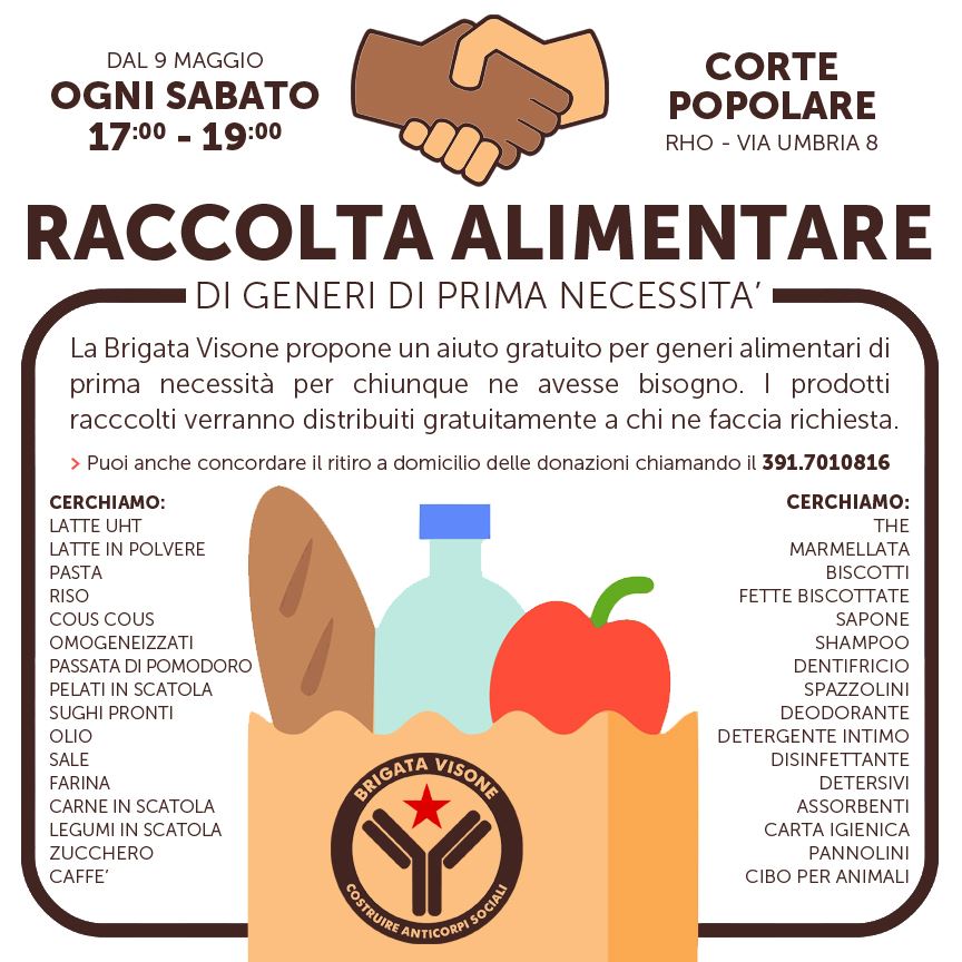 🤝 Da domani e ogni sabato dalle 17:00 alle 19:00 presso la Corte Popolare di via Umbria 8 a Rho (loc. Biringhello) la Brigata Visone organizza una raccolta alimentare di generi di prima necessità.