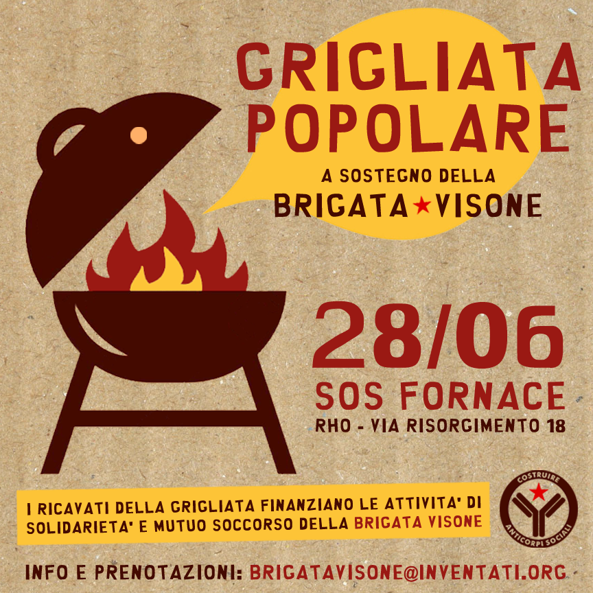 Domenica 28 giugno in Fornace fuoco alle griglie a sostegno di una buona causa: la grigliata popolare sosterrà le attività di solidarietà e mutuo soccorso della Brigata Visone, la brigata di solidarietà nata a Rho per portare aiuto alla popolazione colpita dalla crisi economica e sociale seguita all’epidemia di Coronavirus.