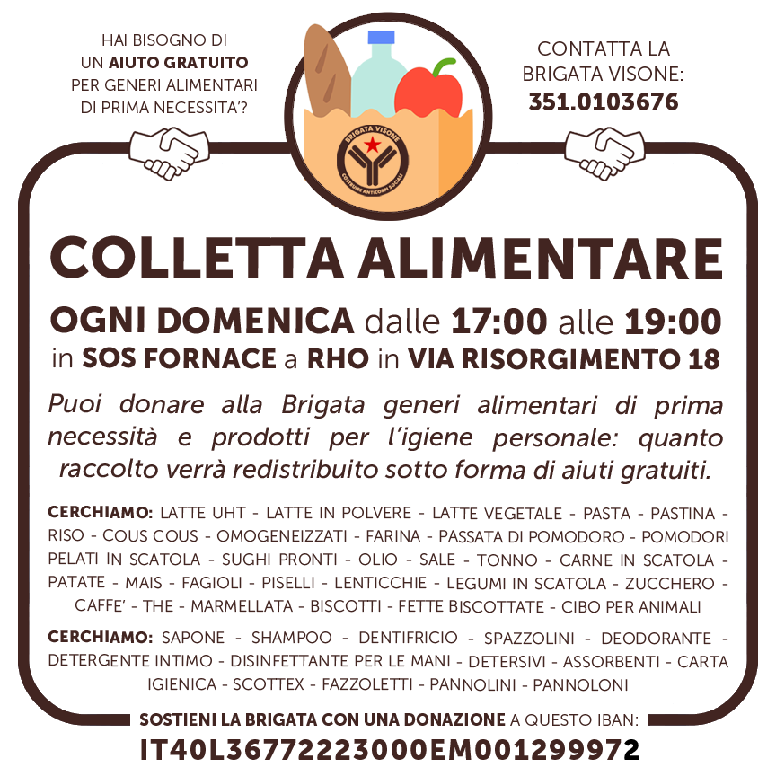 🤝 Ogni domenica dalle 17:00 alle 19:00 in SOS Fornace, in via Risorgimento 18 a Rho, è attivo un punto di raccolta alimentare per generi di prima necessità e prodotti per l’igiene personale che possono esser donati alla Brigata: quanto raccolto verrà redistribuito sotto forma di aiuti gratuiti.