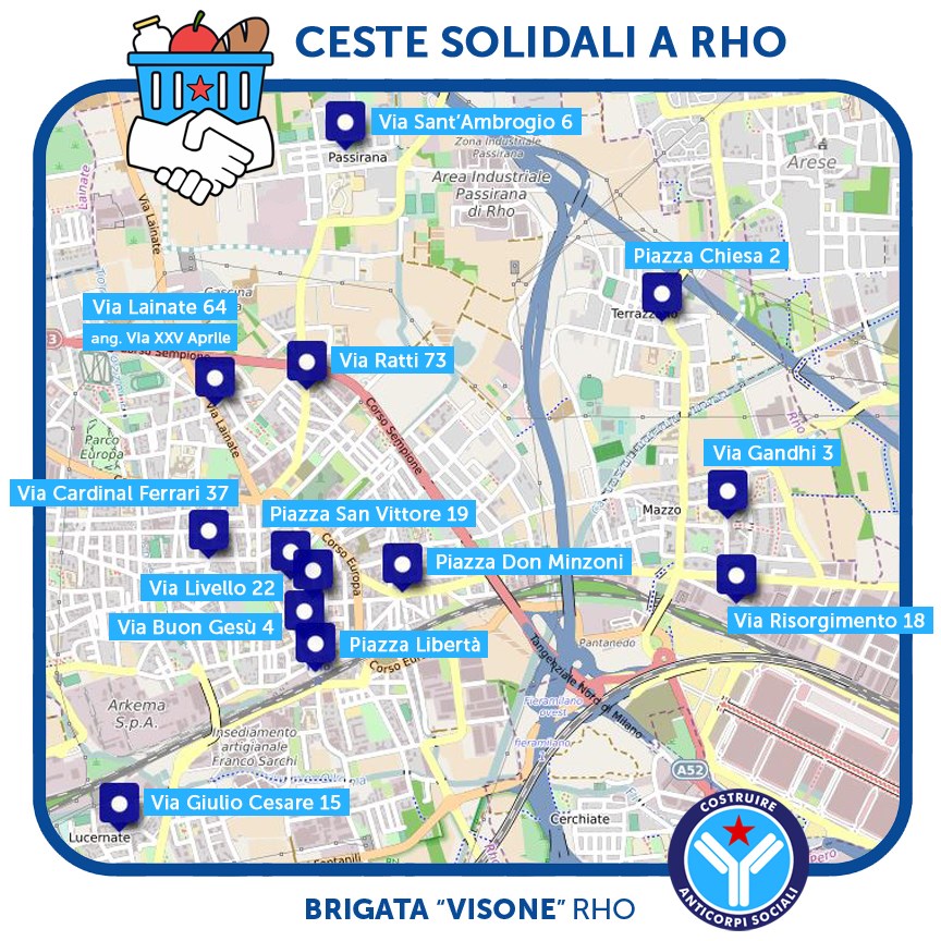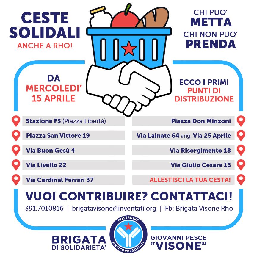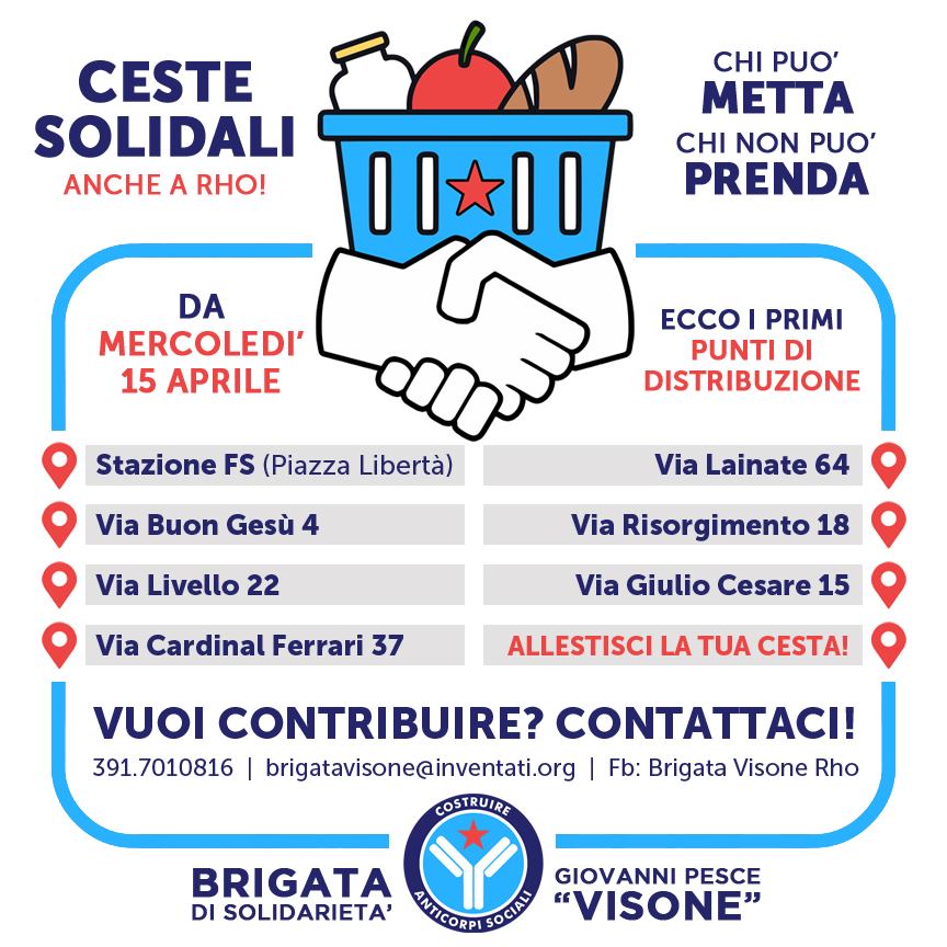 PRIMI PUNTI DI DISTRIBUZIONE IN CITTA’: Stazione FS Rho (Piazza Libertà) Piazza San Vittore 19 Via Buon Gesù 4 Via Livello 22 Via Cardinal Ferrari 37 Via Lainate 64 ang. Via XXV aprile Piazza Don Minzoni Via Risorgimento 18 Via Giulio Cesare 15 COSA SONO LE “CESTE SOLIDALI”?Le “Ceste solidali” sono una rete autogestita di ceste e cassette contenenti generi alimentari di prima necessità e prodotti per l’igiene personale, diffuse in più punti di distribuzione nella nostra città. COME FUNZIONANO?Le “Ceste solidali” funzionano attraverso il principio del “Chi può metta, chi ha bisogno prenda”. Chi ha necessità materiali urgenti può...